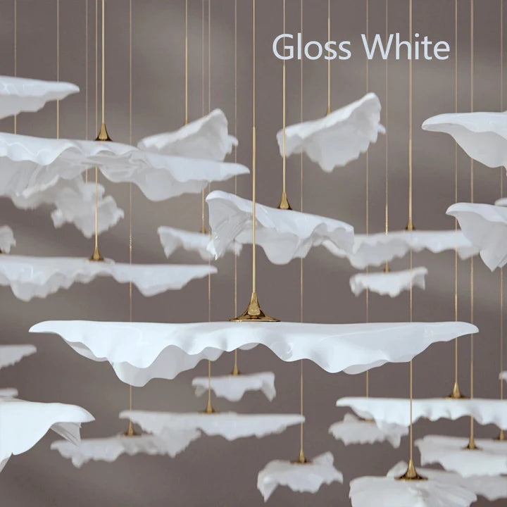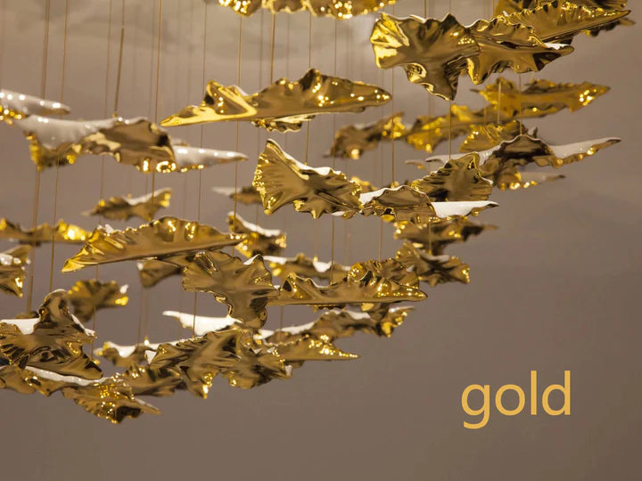 The Rylight 84/102/170/192 Leaves Art Design Chandelier features a unique sculptural design and modern metallic glazes to bring a hint of the natural indoors. This chandelier consists of suspended porcelain leaves and integrated downlights for a sophisticated look. Choose from 4 set compositions, perfect for formal dining rooms, lobbies, and more. The leaf measures 13 x 7 cm (5.12"*2.76") for a subtle hint of nature.