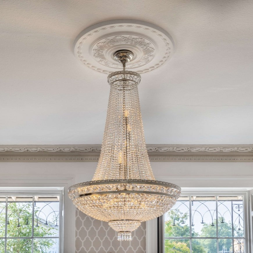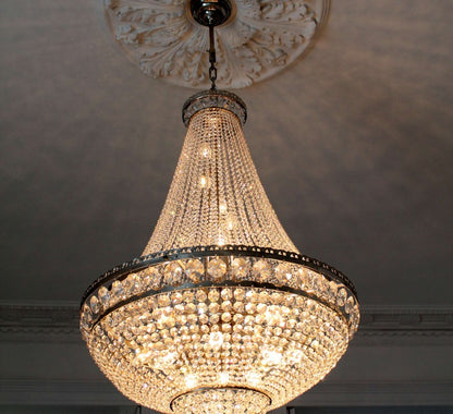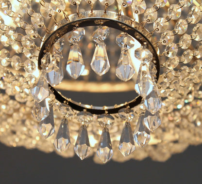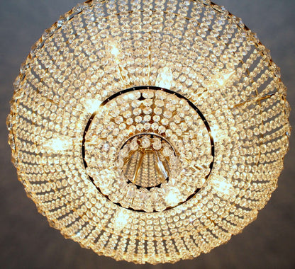 The Rylight Empire Basket Crystal Chandelier is handmade with solid brass and 30% lead crystal droplets, creating a spectacularly elegant lighting masterpiece. The hexagonal droplets of varying sizes cascade in chains surrounding the frame and can be customized to fit any room. Melding luxurious materials with exquisite design, this chandelier will bring a stunning finishing touch to any interior.