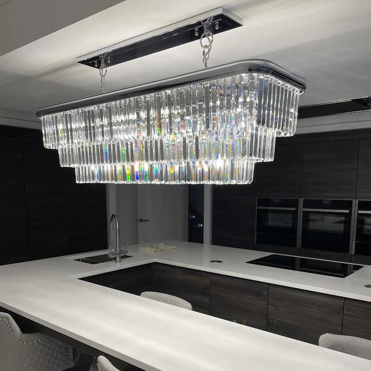 De Rylight 10-lichts rechthoekige kristallen kroonluchter biedt een elegant ontwerp in een gepolijste chroomafwerking. Deze majestueuze kroonluchter past in elk huis of bedrijfspand en wordt geaccentueerd met luxe rechthoekige kristallen stukken voor een indrukwekkende, opvallende look. Perfect voor installatie in ruimtes zoals ontbijtbars, eetkamers of keukeneilanden. De lineaire kristallen hanglamp met 10 lichtpunten voegt een vleugje glans en verfijning toe.