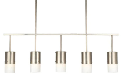 Deze industriële antiek zilveren kroonluchter met 5 lampen heeft een perfecte patina op antiek zilver metaal dat een beetje warmte geeft aan de frisse witte glaskappen. Met een breedte van 150 cm voegt dit industriële glamourarmatuur stijl toe aan de lengte, perfect boven elke eettafel.
