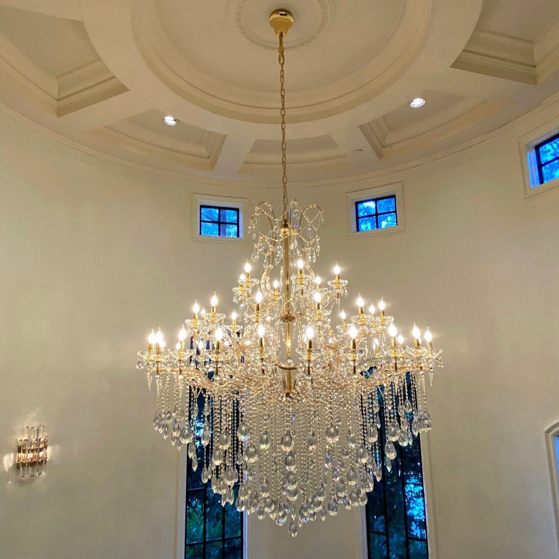 Deze elegante Rylight 44-lichts kaarslicht-kristallen kroonluchter heeft een gouden afwerking en honderden kristallen druppels die het licht opvangen, waardoor een mooie en verfijnde esthetiek ontstaat. Elke arm is omhuld met glas, waardoor een Franse uitstraling ontstaat, en de kroonluchter zelf is gemaakt van kristal. Hij kan eenvoudig op gewelfde of schuine plafonds worden gemonteerd, waardoor hij de perfecte aanvulling is op elke kamer.