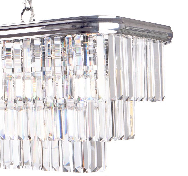 The Rylight 10-Light Rectangular Crystal Chandelier offers an elegant design in a polished chrome finish. Fitting into any home or business property, this majestic chandelier is accentuated with luxurious rectangular crystal pieces for an impressive showstopping look. Perfect for installing in areas like breakfast bars, dining rooms, or kitchen islands, its 10 light linear crystal pendant will add a touch of shimmer and sophistication.