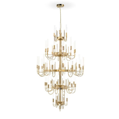 The Rylight 5-Tier Luxury Gala Chandelier adds classic opulence to an entryway or ballroom. Crafted with an exquisite combination of brass and crystal glass, this gold chandelier brings a luxurious feel to the modern age.