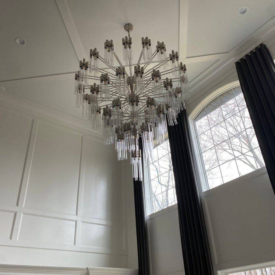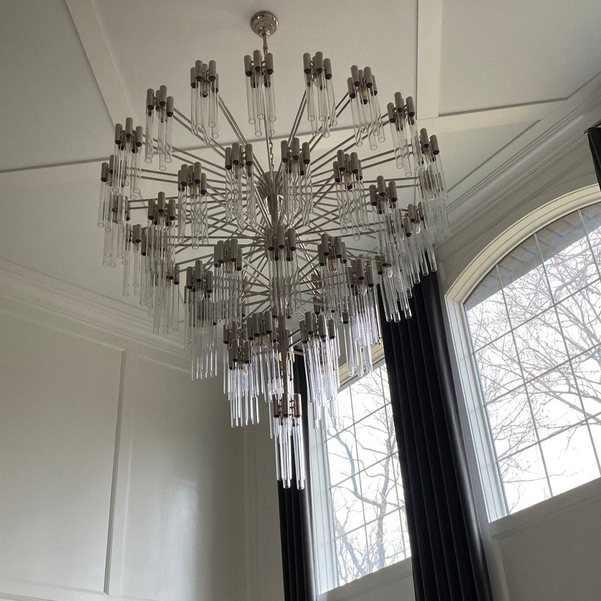 Our Rylight 5-Tier Waterfall Tubular Chandelier is the perfect statement piece for any modern or luxury home. Expertly crafted from chrome and crystal glass, this chandelier boasts an extraordinary silhouette of ribbed tubes and circular levels that cascade like a waterfall. Add grandeur and class to any room with this remarkable handmade masterpiece.
