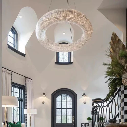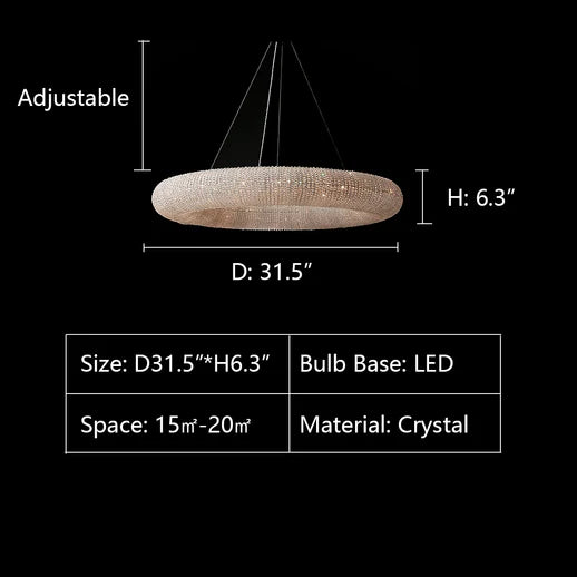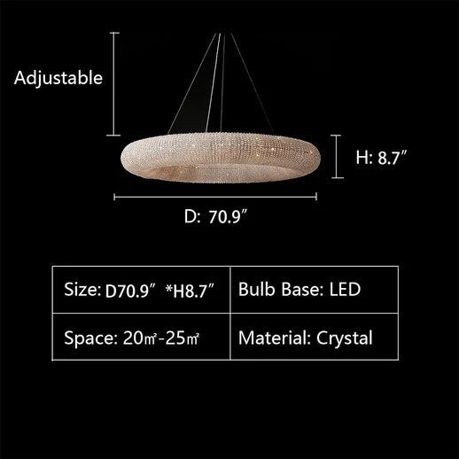 This LED crystal Ring chandelier is simply captivating! The wire-suspended hoop is dress in hundreds of hand selected crystals. If you are looking for something attention-grabbing, this chandelier lighting piece will not disappoint. Pefect for ballrooms, hotel lobbies, hotel wedding decoration, living rooms, clubhouse, bars and offices.